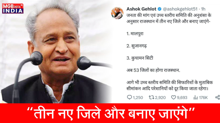 "जनता की मांग एवं उच्च स्तरीय समिति की अनुशंसा के अनुसार राजस्थान में तीन नए जिले और बनाए जाएंगे: मालपुरा, सुजानगढ़ और कुचामन सिटी। अब 53 जिलों का होगा राजस्थान। आगे भी उच्च स्तरीय समिति की सिफारिशों के मुताबिक सीमांकन आदि परेशानियों को दूर किया जाता रहेगा।" एक्स पर राजस्थान के सीएम अशोक गेहलोत ने यह कहते हुए एक पोस्ट किया।